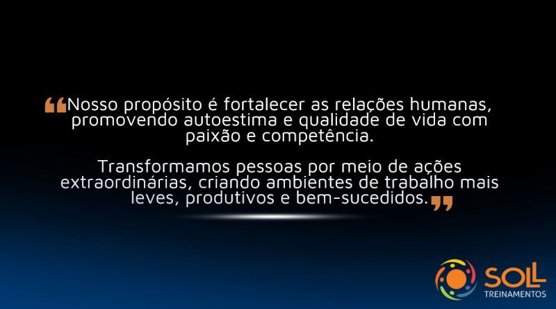 Sempre ouvimos que as empresas buscam incansavelmente o melhor resultado, e que isso depende de como seu time desenvolve seu papel, conseguir envolver e motivar os colaboradores a alcançar os objetivos junto à empresa requer engajamento e algumas táticas para garantir ou proporcionar certa medida de colaboração sólida e eficaz. Esse é o compromisso da empresa Soll Treinamentos.