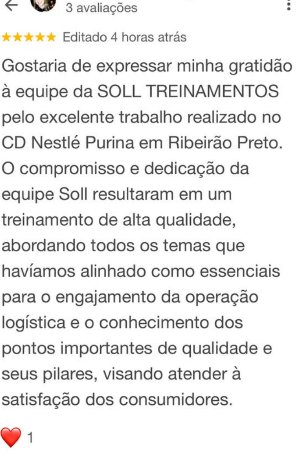 Gostaria de expressar minha gratidão à equipe da SOLL TREINAMENTOS pelo excelente trabalho realizado no CD Nestlé Purina em Ribeirão Preto. O compromisso e dedicação da equipe Soll resultaram em um treinamento de alta qualidade, abordando todos os temas que havíamos alinhado como essenciais para o engajamento da operação logística e o conhecimento dos pontos importantes de qualidade e seus pilares, visando atender à satisfação dos consumidores.